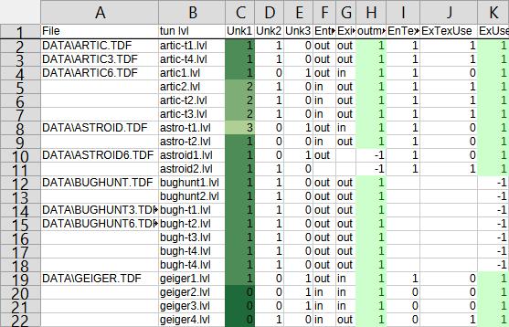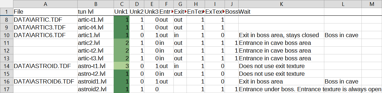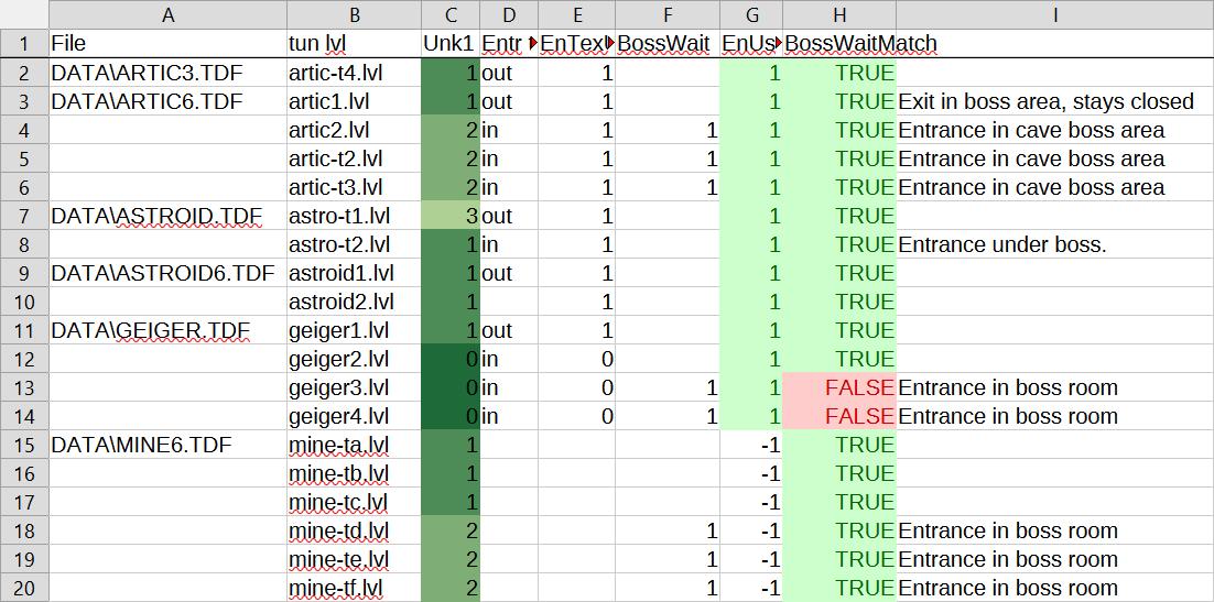 Now that I have some data to compare, I can start to look for patterns in the sheet, and it's quite easy to make new columns that check any hypotheses I make. For example, column G in the sheet above (which is where I note if a tunnel exits outside or inside) seems to exactly match Unknown3, and column I (is the custom exit texture used) seems to match Unknown2.